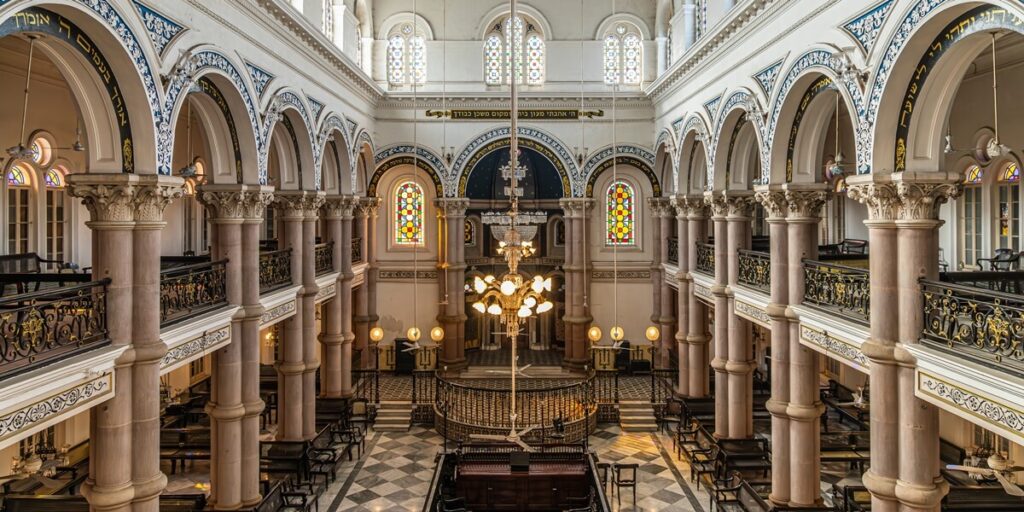 Built in 1884 by Elias David Ezra in memory of his father David Joseph Ezra — who made his fortune in Calcutta’s real estate trade — the Maghen David Synagogue is the largest synagogue in Eastern India and one of the most architecturally significant Jewish buildings in Asia. The Victorian-style building is painted a distinctive sky blue and features ornate ironwork, stained glass, and a soaring interior that speaks to the extraordinary wealth of Calcutta’s Baghdadi Jewish community at its peak.